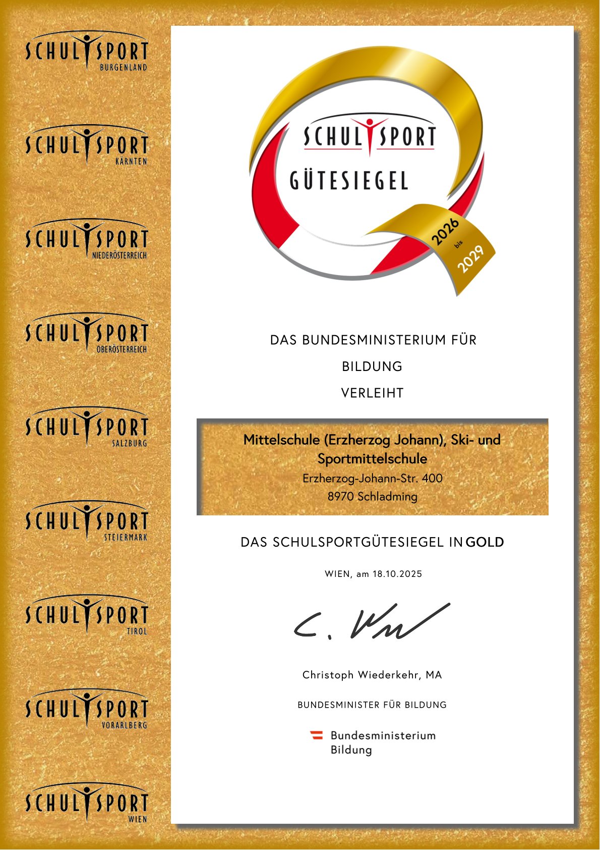 Erneut wurde unsere Schule vom Bundesministerium für Bildung mit dem Schulsportgütesiegel in Gold ausgezeichnet. Die feierliche Verleihung der Auszeichnung fand am 24. November in der Grazer Burg statt.